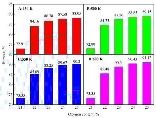 To further reveal the reasons causing the aforementioned phenomena, the change of coal burnout across the whole combustion process was investigated, as shown in Figure 8b. The coal combustion process was delayed under the effect of room-temperature oxygen, which became more obvious as more oxygen was added. Du et al. [12]. also found the same phenomenon. Significant devolatilization just starts around 600 K [25]. The room-temperature oxygen first competed for limited heat with coal particles, and then the combustion distance of char would be shortened. Some coal particles would leave the raceway region without complete combustion even at rich oxygen concentration.
