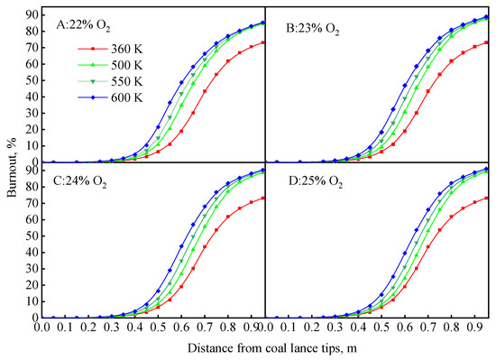 To further understand the effect of coal particle temperature, the coal burnout at different positions was investigated, as shown in Figure 15. In general, the coal combustion process was enhanced, which became more obvious with an increase in the coal particle temperature. The hysteresis of the coal combustion process caused by the room-temperature oxygen disappeared with an increase in the coal particle temperature. This is because the heat of coal particles makes up for the cooling effect of room-temperature oxygen. The coal particles had more time to combust, meaning the coal burnout quickly increased under sufficient oxygen.
