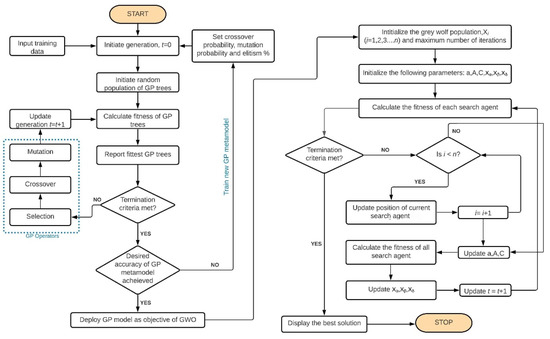 Flowchart for the proposed hybrid genetic programming–gray wolf optimization (GP-GWO) approach.