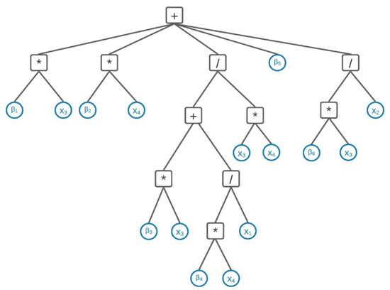 Genetic programming is a predictive model building or metamodeling approach that uses Darwin’s theory of natural selection as an inspiration [13]. Genetic programming (GP) initiates by generating a host of random candidate solutions (i.e., GP trees). This set of solutions is collectively called the population. In this paper, the GP trees are constructed from a pool of pre-selected functions and a set of terminals . Here, represent catalyst concentration, reaction temperature, alcohol-to-oil molar ratio, and reaction time, respectively. In the GP process, all the process parameters (i.e., the independent variables) are treated as terminals. In addition, the coefficients of regression (i.e., ) are considered as the terminals. can be any real number.