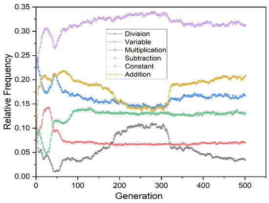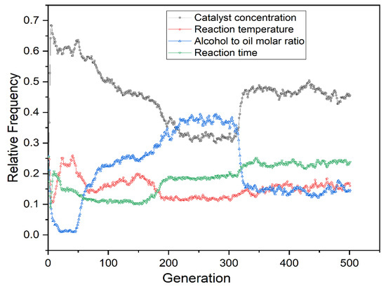 The metamodel represented in Equation (12) can be visualized in the form of a GP tree, as shown in Figure 2. The variation in the relative frequency of the functions (i.e., ) and the terminals (i.e., constants and variables) over the 500 generations of the GP process is shown in Figure 3. It is seen that the constants (i.e., the β coefficients) have the most relative occurrence in the GP trees. Similarly, in Figure 4, the relative frequency of the individual process parameters in the GP trees over the entire generation limit is shown. It is seen that the catalyst concentration has the most occurrence in the GP trees. The impact of each process parameter is calculated on the GP trees, and it is found that the catalyst concentration, reaction temperature, alcohol-to-molar ratio, and reaction time have an impact of 90.60%, 8.43%, 0.54%, and 0.43% respectively. This finding is in sync with the inferences reported by Gülüm et al. [12] based on an RSM study where they conclude catalyst concentration and reaction temperature to be the most important parameters among the four. However, it is worth mentioning here that Gülüm et al. [12] had to carry out additional tests such as ANOVA (analysis of variance) to calculate the relative impact of the variables.