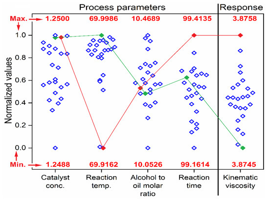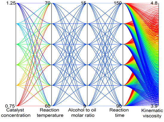 Parallel plot showing the effect of the various process parameters on the kinematic viscosity.