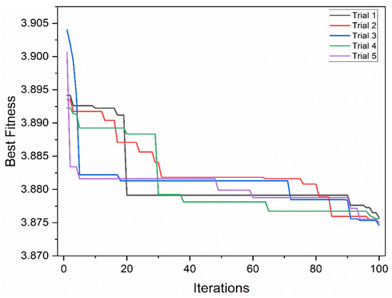 Figure 8 shows the convergence of the GWO for five typical trials. It is seen that the GWO rapidly converges across iterations. The overall 50,000 function evaluations for each of the 25 GWO trials are plotted in Figure 9. In general, it is seen that the median of the evaluated functions is much lower than the mean. This indicates that the majority of the evaluated functions have high fitness (i.e., lower kinematic viscosity value). This is indicative of a smaller number of function evaluations required to reach the optimal zone. The optimal values reported by the GWO algorithm for 25 independent trials are plotted in Figure 10. The best and the worst optimal response values reported by the GWO are 3.8745 cSt and 3.8758 cSt, i.e., a difference of approximately 0.035% to the best optimal solution. This negligible deviation in the optimal solution reported by the GWO while conducting independent trials indicates the high precision and repeatability of the GWO. Thus, by the current approach, the global optimal solution for minimizing the kinematic viscosity is obtained at catalyst concentration 1.25 wt %, reaction temperature 69.9986 °C, alcohol-to-oil molar ratio of 10.2537:1, and reaction time of 96.3198 min with a kinematic viscosity of 3.8745 cSt. The current solution is better than the optimal solution reported by Gülüm et al. [12] using RSM as 3.878 cSt (0.09% better), that reported experimentally as 3.886 cSt (0.3% better), and that reported using cubic spline interpolation as 3.945 cSt (1.79% better).