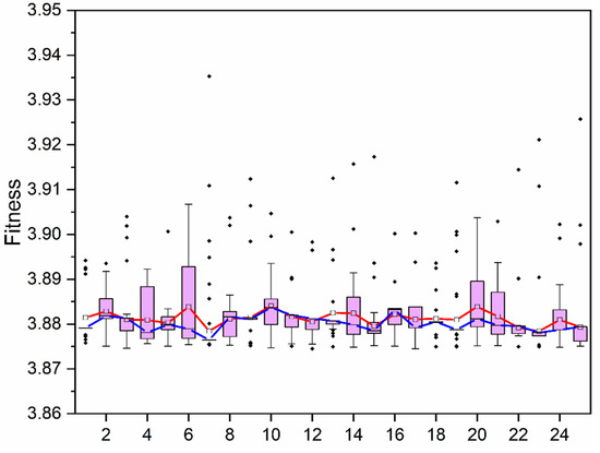 Box plot of 50,000 function evaluations of 25 independent GWO trials. The red line connects the mean of the box plots, while the blue line connects the medians.