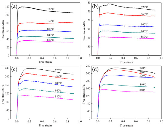 True stress–true strain curves of the Cu-Ni-Sn-Zn-Mn alloy at a strain rate of (a) 0.001 s−1, (b) 0.01 s−1, (c) 0.1 s−1, and (d) 1 s−1.