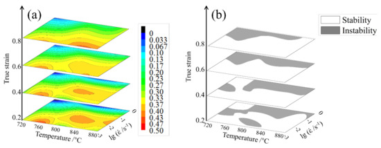 Using the data of the flow stress under different deformation conditions at a true strain from 0.2–0.8 with an interval of 0.2, the efficiency of the power dissipation and flow instability are displayed in Figure 4a,b, respectively.