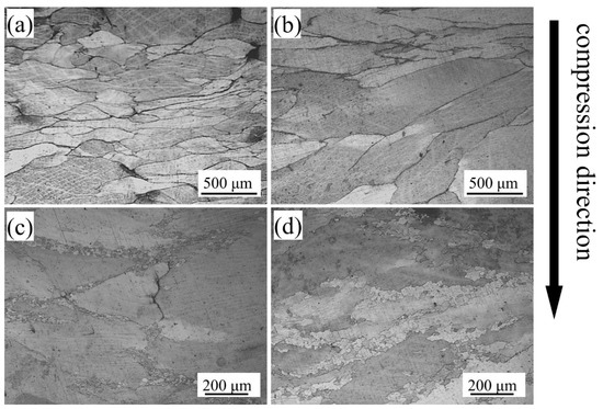 Optical microscopy (OM) images of the alloy deformed at 800 °C with a strain rate of (a) 1 s−1, (b) 0.1 s−1, (c) 0.01 s−1, and (d) 0.001 s−1.