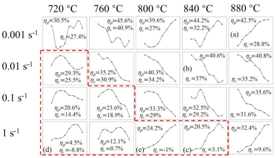 In Figure 9, each small picture represents a deformation process under the specified hot deformation condition. In each small picture, the curve represents the variation of η with the increase of the true strain. The peak values (ηp) and valley values (ηv) of η are displayed in every separate picture. The value of ηp increased with the increase of the deformation temperature and decrease of the strain rate, suggesting that the softening mechanism changed from DRV to DRX. The ηv value had a similar rule under most of the deformation conditions. The results with values of ηp below 30% are included in the dotted box. The softening mechanism of the samples deformed in this area was always DRV during the whole deformation process. It is worth noting that this area was integrally located in Domain A in Figure 8, where flow instability may have taken place and hot deformation was not appropriate to conduct.