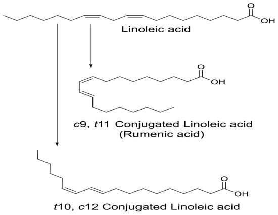 CLA are naturally occurring isomers of fatty acids found in ruminant animal food products []. There are 28 known CLA isomers identified with different position (ranging from Δ7, Δ9 to Δ12, Δ14) of cis or trans geometry. The most common biological isomers are the cis-9, trans-11(c9, t11), which accounts for more than 80% of CLA isomers in dairy products and cis-12, trans-10 (t10, c12), present in some ruminant fats []. The natural product of CLA is a mixture of two isomers: c9, t11 and t10, c12 available by partial hydrogenation of linoleic acid and/or isomerization of cis unsaturated fatty acids, using bacterial enzymes as catalysts (Figure 1) []. Many bacteria have been reported to convert free LA into CLA: Butyrivibrio fibrisolvens [], Megasphaera elsdenii [], Lactobacillus reuteri [], L. acididophilus [], L plantarum [], and Bifidobacterium breve [].