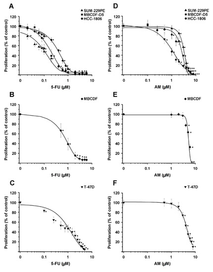3.1. 5-FU and AM Alone Inhibited Breast Cancer Cell Proliferation in a Dose-Dependent Manner