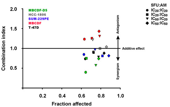 To our knowledge, this is the first report showing the combined effects of 5-FU with AM in breast cancer cells with different phenotypes. Interestingly, the synergic interaction between 5-FU and AM was not observed in MBCDF cells [54], which can satisfactorily be explained by the high cellular heterogeneity prevailing in this cell line [41,55].