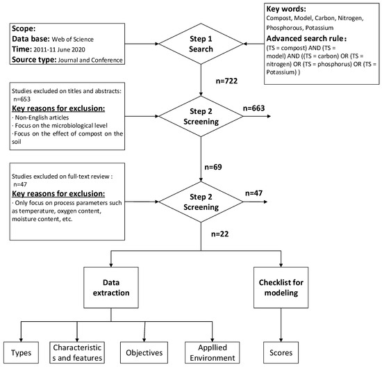 A total of 722 related articles were collected, followed by a precise refining process based on the following three criteria, including: (1) the substrates for composting were OSW; (2) the target variables of modeling objectives involved at least one of C, N, P, and K; (3) the research modeled the process of composting technology. Specifically, the process of study selection and data extraction consists of three steps of results retrieval [37,38], as shown in Figure 1. First, search for articles based on a prioritized search strategy. Then, filter out irrelevant or unsuitable articles according to their titles and abstracts. Third, read the filtered articles in full text. Finally, a total of 22 models were selected for further studies, which are mainly from peer-reviewed journals or conferences such as Bioresource Technology, Environmental Technology, and Waste Management.