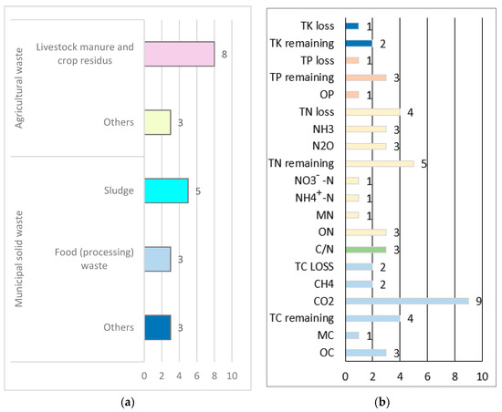 The specific substrates of these models involved MSW and agricultural waste, as shown in Figure 3a. MSW mainly includes sludge (n = 5) and food waste or food processing waste (n = 3). In comparison, other types of municipal waste have been studied, including cardboard, boxwood leaves, and sawdust (n = 3). In these models, most of the simulation of agricultural waste concentrated on livestock manure and crop residues, such as pig manure, chicken manure, and cattle manure mixed with straws of rice, wheat, and corn (n = 8). In addition, other types of agricultural wastes include vegetable wastes and fruit leaves (n = 3).