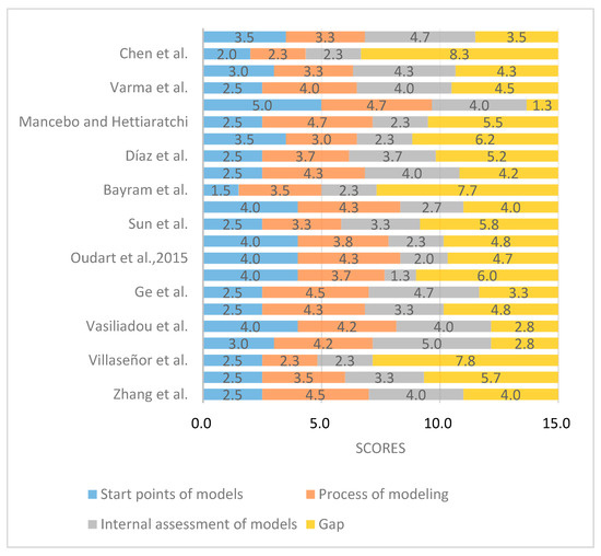 With the checklist, the scores of gaps ranged from 1.3 to 7.7, which can be seen in Figure 4. The model’s scores were only obtained in the checklist that we created to show the gaps between the target models. The checklist could efficiently describe the fates of C, N, P, and K during composting. It was not aimed to completely distinguish the advantages and disadvantages of models, but largely focused on checking whether these models fit the scope and subject of the review, and how well they fitted the procedures modeled. It can be seen from Figure 4 that the research of Faverial et al. was more in line with the scope of the review, while the overall modeling was also in line with the specification, having an excellent performance in accuracy [15]. The paper of Chen et al., a conference paper with limited space, also attracted our attention, in which their scores were affected as some modeling procedures may not be described in details [71]. The starting points of the model involve the target variables of modeling objectives; however, there are many models that do not fully include C, N, P, and K. When the starting points of the model are excluded from checklist results, there are more models that also perform very well.