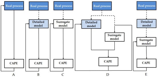 Surrogate-based Computer-Aided Process Engineering (CAPE) activities [59] (A: approach without model, B: approach with detailed model, C: approach with surrogate model, D: multi-fidelity approach, E: surrogate model is used to accelerate the detailed model.