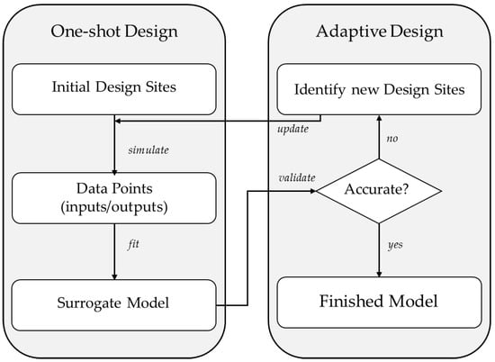 Sampling is the step of generating data points that can be used in surrogate model building. Basically, two types of sampling strategies are differentiated that can be applied to surrogate design, namely adaptive sampling and stationary sampling. Figure 6 represents the comparison of the main steps of stationary and adaptive sampling processes. Stationary sampling methods rely on geometry or patterns. Frequently applied stationary sampling methods are Latin Hypercube Sampling (LHS) as well as the Sobol and Halton sequences [52]. LHS is a statistical method for generating a near-random sample of parameter values from a multidimensional distribution. Sobol and Halton sequences are quasi-random approaches. In these methods, Sobol and Halton low-discrepancy sequences are used to draw the samples. In the case of adaptive methods, new sample locations are determined serially. To start with, a lower number of samples are generated usually using stationary methods. The aim of the adaptive sampling strategy is to decrease sampling requirements by obtaining more samples that improve the quality of the surrogate. Different sampling methods are described in detail in [52]. In Table 4, publications from the last three years were collected. It appears that both stationary and adaptive methods are in use in engineering practices.