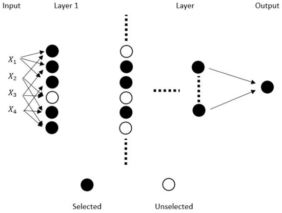 GMDH is a self-organizing feed-forward neural network algorithm which have capability of solving very complex non-linear problems having several inputs and one output (Xi,yi) (=1,2,….,M). Neuron layers define the GMDH model. In this algorithm, the effective input variables, the number of layers, neurons within the hidden layers and the optimum model configuration are calculated automatically. Through quadratic polynomials, each neuron layer has many data points connected to each other, and new neurons are created in the process [39,40]. The general structure of the model is depicted in Figure 4 and Figure 5 by Cai et al. [28]. Input parameters are entered in the first layer and some functions are defined. Some parameters are selected and transferred to the next layer and some are left out.