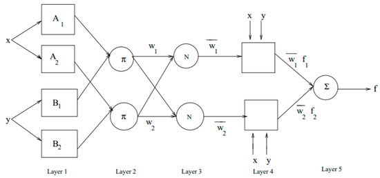 ANFIS structure for two inputs (x and y) and one output (f) [44].