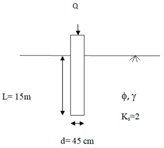 The bearing capacity of piles (Q) is the addition of soil friction (Qf) caused by the perimeter area and bearing resistance (Qb) transferred by base area to the ground. Note that, the bearing capacity of piles depends on the length () and diameter () of the pile, and soil properties, such as cohesion (C), angle of internal friction (φ), and unit weight (γ) of soils. For pure sand, i.e., for cohesionless soils, C = 0; and thus, the bearing capacity of piles in pure sand is the function of L, D, φ, and γ only. On the other hand, L and D are deterministic parameters which are irrelative in reliability analysis; and therefore, the effect of φ, γ on output parameter (Q) can be expresses as follows [34]: