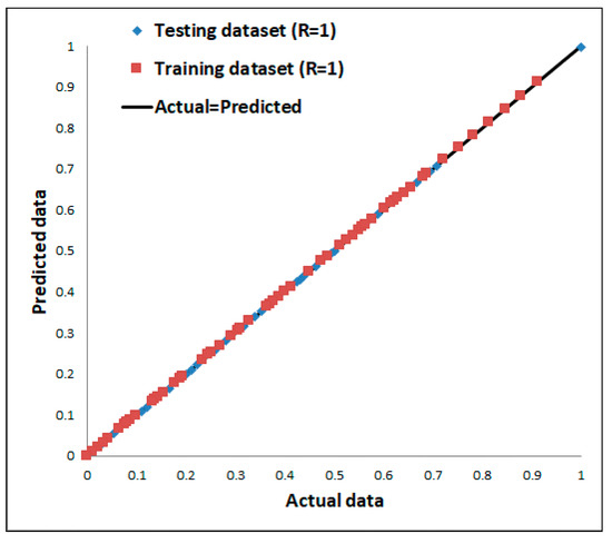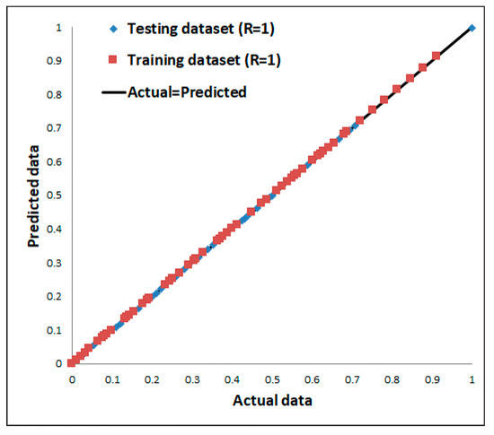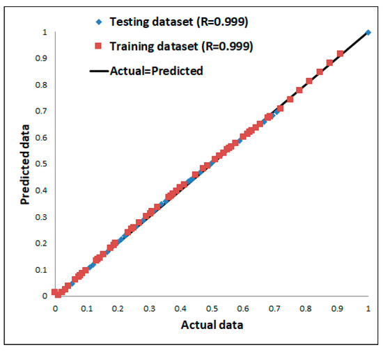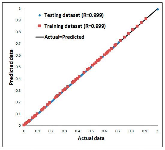 The training dataset was used to construct the ENN model, while the testing dataset was used to validate the developed ENN model. The developed ENN model attained 99.9% prediction accuracy in terms of R2 in both phases (R2 = 0.999).