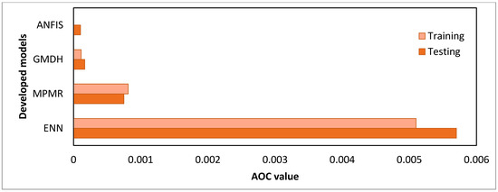 Regression Error Characteristic (REC) curve for both the models, drawn using MATLAB is given in Figure 13, Figure 14 and Figure 15 represents the area over the REC curve (AOC) values of both the models for both the phases. Values of AOC enumerate the expected error of the regression models. Better models have lower values. The AOC values are quite analogous to each other for both the models. All the models give excellent AOC values and so all the models are robust models for prediction. Comparing the models, ENN’s reliability is worst compared to companion models. ANFIS in training phase possess least value of AOC.