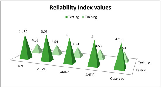 Reliability indices are calculated as per Equations (5)–(8) using the predicted outputs for all the models and compared with the reliability index calculated from observed outputs calculated using Equation (1). Reliability index values of both the models (Figure 16) are very close to the observed value. Hence, both the models are reliable to be used for the reliability analysis of pile foundation.