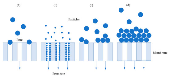 Common blocking mechanisms for dead-end filtration: (a) complete blocking, (b) standard blocking, (c) intermediate blocking, (d) cake filtration.