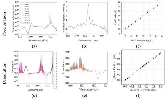 As an additional analyzation method, a PCA is performed for dissolution raw data, which indicates that most spectral information is located between 1800–850 cm−1. Therefore, spectral data are reduced further to this region (Figure 11b,e). Here again the observation is made, that in precipitation the PLS regression for LMWs is very good with a R2 of 0.94 but is very poor for HMWs (R2 of 0.43) and the target component (R2 of 0.42). In dissolution convincing results are achieved (R2 of 0.91) for the target component and only poor results for HMWs (R2 of 0.31) and LMWs (R2 of 0.54). PLS regression for purity did not lead to any satisfactory results in neither precipitation nor dissolution. Nevertheless, it can be concluded that FTIR is a suitable detector for LMWs during precipitation and for the target component in dissolution.