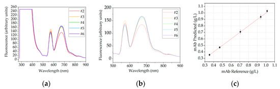 In this section Raman spectral data are discussed, first for precipitation and following for dissolution. The results (mAb titer and purity) obtained in dissolution are the results of interest for the following unit operation. First, raw data are reduced to 1800–400 cm−1 Raman shift equally for precipitation and dissolution results. It becomes obvious, that spectral raw data for both steps are very distinct (Figure 6a,b). This can be explained by the different matrix of the samples. In precipitation the continuous phase is still the light phase obtained from ATPE, including the phase forming components phosphate and PEG 400 as well as the majority of impurities generated during USP.