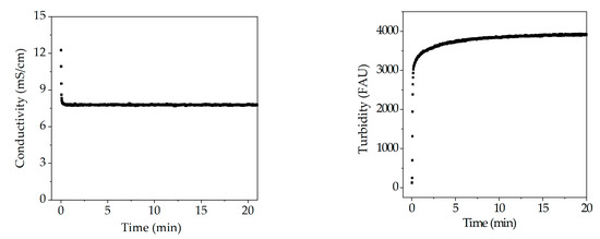 In this section further detectors are evaluated within the PAT concept. Sensors can be used to monitor changes during the manufacturing process. Investigation of pH, conductivity and turbidity sensors during precipitation are shown in Figure 18. pH value remains constant throughout precipitation which indicates that no process information can be correlated to this metrology. Light phase has a conductivity of approximately 12 mS/cm in contrast to the PEG solution, which is not conductive. Therefore, conductivity drops as soon as PEG is added and remains constant afterwards. Conductivity indicates the composition of the dispersion. Hence, conductivity can be used to monitor the component ratio between light phase and PEG 4000 online within a PAT concept to ensure optimal precipitation conditions. Turbidity has, as conductivity, a strong deflection during addition of PEG, because precipitate formation occurs instantaneous. For this reason, turbidity is a measure for the precipitation progress. However, turbidity is not specific to one component, but it gives an estimate on process duration.