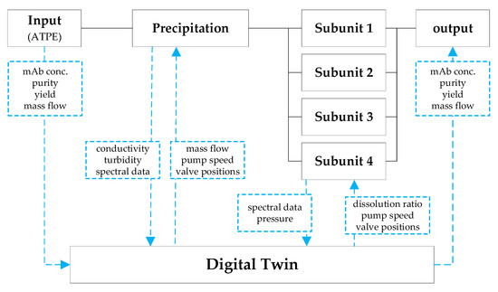 Additive effects are eliminated by conducting a derivation or applying a baseline correction. Multiplicative scatter effects can be removed using the method of standard normal variate (SNV) or a multiplicative scatter correction (MSC). Combinations of additive and multiplicative effects are removed by a combination of baseline correction, and scatter correction and complex effects can be eliminated by using an extended multiplicative scatter correction (EMSC). Depending on the scatter effects, the pre-processing is adapted to extract a maximal information content. Pre-processed spectra are then used to correlate the changes in component concentration to the changes in spectral intensity at specific spectral regions by partial least squares regression. A maximum of four principal components was allowed in the regression to not overfit the data. The quality of the model was evaluated by means of spectral line loadings plot, score plot, and the plot of explained variance against number of principal components. If Pat inline would be feasible, another tool for APC would be a suitable digital twin based on process modeling as described in the following. Based on the precipitation unit proposed in a previous work [4], the process model for the APC concept is presented. The model is divided in to three sub models: Precipitation of mAb, filtration of precipitates and resolution of precipitated mAb which is schematically shown in Figure 3. Division into sub models is necessary for separation of effects within precipitation, filtration, and dissolution.