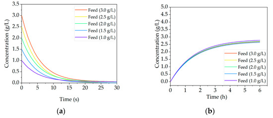 Model equations for dissolution are based on the same mechanism as precipitation, however, with a different mass transfer coefficient for dissolution. Product losses in dissolution may occur due to two cases: limitation through the feed concentration or the maximal protein solubility. The limitation by the feed concentration () appears when the equilibrium concentration in the dissolution buffer is significantly higher than the mAb concentration in the feed. In this case the complete initially precipitated mass of mAb can be redissolved (see Equation (7)). If the depletion of the PEG or the volume ratio (DR) between feed and buffer is too low, limitation by equilibrium concentration (see Equation (8)) is the result due to a residual PEG content which should not exceed 3 wt % [13]. describes the reaction kinetic dissolution of precipitates dependent on the circulation flowrate through the fibers. it the current mAb concentration dissolved in the dissolution buffer and the equilibrium concentration of mAb in dissolution. As described before, equilibrium parameters do not change in dissolution, but the equilibrium concentration does due to reduction of the PEG content in solution. DR describes the ratio between feed and dissolution buffer volume.