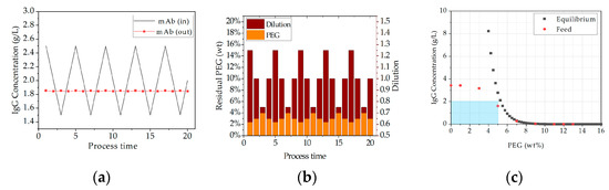 Second simulation study results of scenario one (concentration fluctuations). (a) shows the comparison of incoming concentration and the adjusted IgG concentration after dissolution because of the integrated APC. (b) shows the parameter that must be controlled to achieve the constant output concentration of 2 g/L and (c) depicts the equilibrium concentration of IgG in presence of PEG. The blue zone in (c) marks the operating window of residual PEG content.