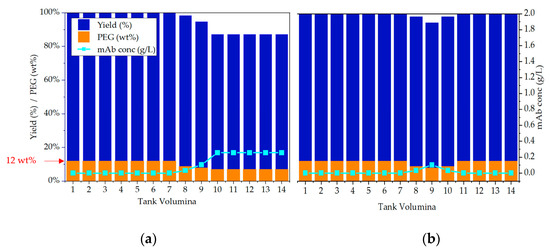 In the following section simulation studies regarding scenario two, which address mass flow fluctuations, are presented. Initial simulations have shown that volume fluctuations mainly affect the precipitation step. This occurs because the supernatant is removed by filtration and is, therefore, not passed on to the subsequent dissolution. The simulations have also shown that an elevated PEG content does not lead to yield loss, hence, here only the simulation results in case of an insufficient PEG content are shown. points out the potential failure mode with and without the integration of the proposed APC. Changes in the mass flow impact the present precipitation conditions in the precipitation tank, which are monitored with the conductivity probe. If this disturbance occurs over a longer period than a few seconds a wrong ratio between PEG and light phase would be present in the precipitation tank in relation to its residence time. This case is shown in Figure 23a. During operation, the required PEG content of 12 wt % can no longer be maintained (orange columns), which leads to an increase in the equilibrium concentration of IgG (light blue line). As a result, the target component no longer precipitates completely, and a residual portion remains dissolved which are potential yield losses. This dissolved residue would then be discarded through dead-end filtration which is not desirable. This loss is indicated by the decreased yield in the precipitation step (blue columns).