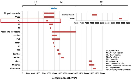 Density ranges of common components of mixed waste fractions and their respective product of the separation process [14].