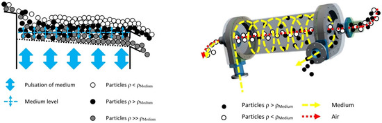 Function principle of the core components: Jig (left) and centrifugal force separator [13] (right) (Reproduced with permission from Schwabl D.; Proceedings of the tenth “Recycling und Rohstoffe” Conference published by TK-Verlag, Berlin, 2017).