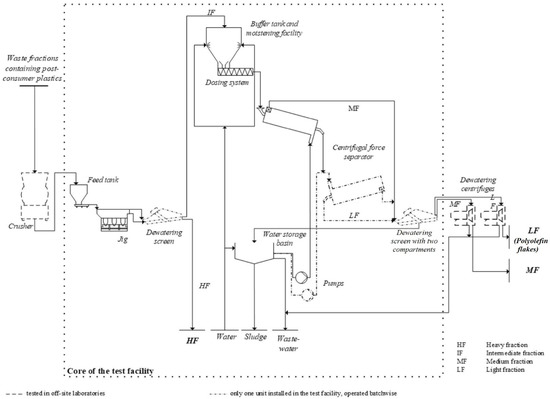 A lab-scale plant was built to examine the possibility of recovering polyolefins from the determined feedstocks. The plant basically consisted of two core components, which each conducted a certain kind of density separation to recover a light (LF), middle (MF), and a heavy fraction (HF), as can be seen in Figure 2.
