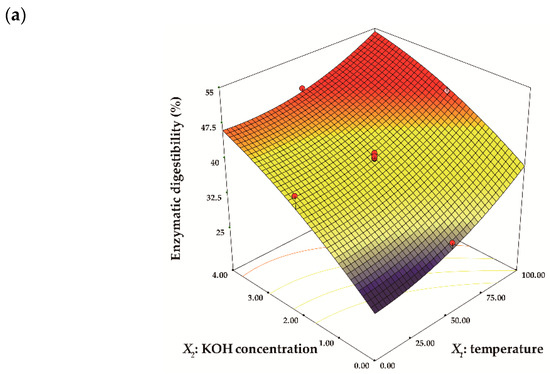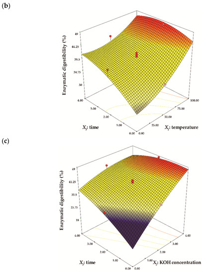 The three-dimensional response surface plot for the effect of the experimental factors on enzymatic digestibility. Effects of temperature and KOH concentration (a), temperature and time (b) and KOH concentration and time (c).