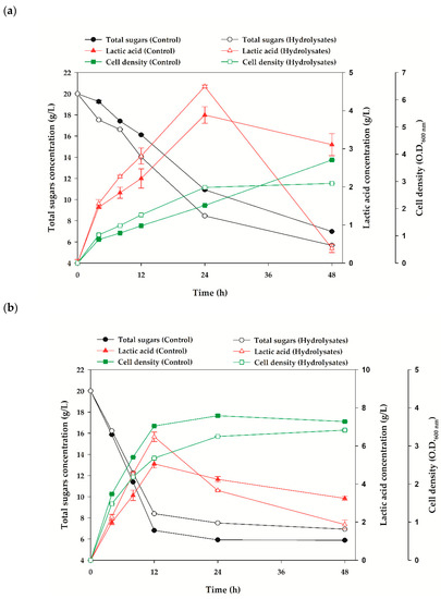 Lactic acid production by fermentation of L. brevis ATCC 8287 (a) and L. parabuchneri ATCC 49374 (b) using SCG hydrolysates (control medium: filled symbol and SCG hydrolysate medium: hollow symbol).