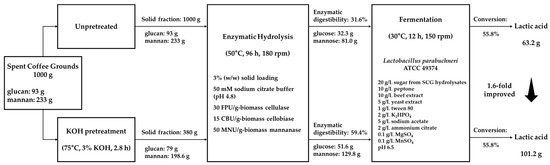 The material balance was established based on 1000 g of SCGs to evaluate the overall process of biomass conversion to lactic acid (Figure 6). A total of 380 g of solid was recovered after pretreatment of 1000 g of SCGs under the optimum conditions and consisted of 79 g glucan and 198.6 g mannan. The pretreated SCGs were enzymatically hydrolyzed to 51.6 g glucose and 129.8 g mannose at 50 °C and 180 rpm for 96 h, with an enzyme loading of 30 FPU/g biomass cellulase, 15 CBU/g biomass cellobiase and 50 MNU/g biomass mannanase. The fermentable sugar from the SCGs was used as the carbon source to produce lactic acid. The hydrolysates of pretreated SCGs were converted to 101.2 g lactic acid by L. parabuchneri ATCC 49374 fermentation, showing a 1.6-fold improvement compared with the control (untreated SCG hydrolysates).