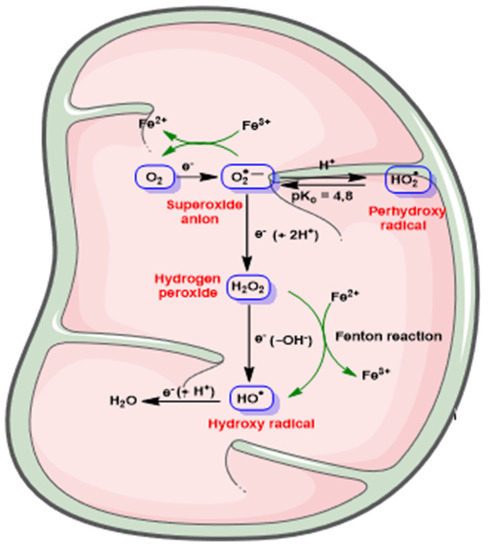 As we age, the rate of generation of reactive oxygen species by mitochondria, the main source of their production, increases [5]. The increased production of these species inflicts injury to the inner membrane of the mitochondria, which by a positive feedback mechanism induces an increase in the generation of reactive species. As mitochondria are the most important source of reactive oxygen species, it is obvious that mitochondrial DNA is more exposed than nuclear DNA to severe oxidative damage that can lead to mutations and deletions in its own strand. The lower energy production would affect cell function, and on the other hand, the alteration in the electronic transport chain would increase the rate of generation of reactive oxygen species. In this case, the localized alteration would be aggravated by causing subsequent damage to mitochondrial DNA [5,6]. Changes to the equilibrium of ROS production (Figure 1) and the potential to sustain a high degree of antioxidant resistance contributes to oxidative stress. Therefore, cells have sophisticated DNA repair systems. Additionally, they are related to the decrease in the number of mitochondria, a typical characteristic of aging cells [6]. The changes in the diet leading to a reduction in the generation of reactive oxygen species by the mitochondria is presented as one of the most effective antioxidants means to ensure good health and even prolong life [7].