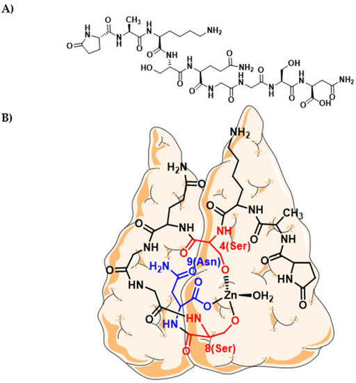 Molecular structure of the hormone thymulin (A) and preferred form of chelation of thymulin with Zinc (B).