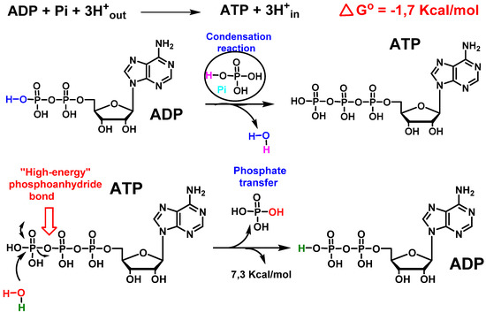 ADP conversion to adenosine triphosphate (ATP) by condensation reaction involves the transport of H+ protons across the mitochondrial inner membrane to the intermembrane space, whereas the reaction to produce ATP from ADP have a negative Gibbs free energy, ∆G ≤ 0, and occurs spontaneously.