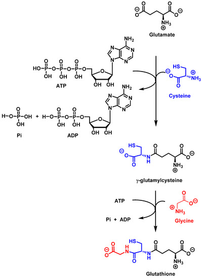 During ex-novo synthesis of glutathione, glutamate, and cysteine are combined by the enzyme glutamate-cysteine ligase (GCL) to form glutamyl-cysteine, which is then combined with glycine by glutathione synthase (GS). GSH is synthesized in a 2-step reaction, requiring two molecules of adenosine triphosphate ATP, which are transformed into ADP and Pi. GSH is a reductant in cellular redox reactions, forming glutathione disulfide (GSSG), which can be reduced again to regenerate the GSH.