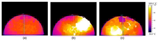 Figure 5 illustrates the temperature distribution of SCB specimens with different mixture types after microwave heating. Although PA1 (Figure 5a) showed a lower heating temperature than PA2 and PA3, its temperature was more evenly distributed and did not show a temperature concentration area, as was presented in the other two groups (Figure 5b,c). Besides, it is noticed that the temperature inside the sample can be much higher than on the surface, and this is found in both Figure 5b,c, where some areas behind the surface aggregate exhibit brighter colours. As such, the microwave heating technique can potentially achieve damage healing beneath the surface of the asphalt mixture.