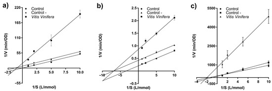 Lineweaver–Burk plot of extracts from Vitis vinifera on three enzymes. ((a) acetylcholinesterase, (b) lipase, and (c) α-glucosidase).