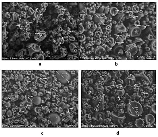 SEM images of spray-dried Tintorera grapes extracts at two percentage of maltodextrin and two inlet temperatures. ((a) maltodextrin 10% and inlet temperature 90 °C, (b). maltodextrin 30% and inlet temperature 90 °C, (c). maltodextrin 10% and inlet temperature 120 °C, and (d). maltodextrin 30% and inlet temperature 120 °C).