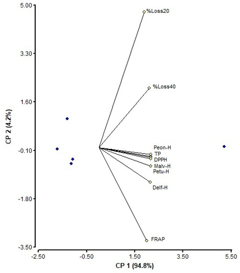 PCA was employed by mean centered data based on the eigen values to determine the correlation between variables and the discrimination of anthocyanin contents of Tintorera formulations and antioxidant characteristics in different conditions of temperature of the process and storage temperature. The variables used were percentage of losses of malvidin 3-hexoside in formulations maintained at 20 °C (%Loss20), percentage of losses of malvidin 3-hexoside in formulations maintained at 40 °C (%Loss40), malvidin 3-hexoside content (Malv-H), peonidin 3-hexoside content (Peon-H), petunidin 3-hexoside content (Petu-H), delphinidin 3-hexoside content (Delf-H), total polyphenol contents (TP), DPPH assay (DPPH), and FRAP assay (FRAP).