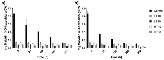 Malvidin 3-hexosides concentration losses in formulations (LT10, LT30, HT10, and HT30) stored at (a) 20 °C and (b) 40 °C, for 672 h.