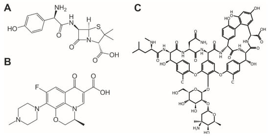 Structure of antibiotics used in the study: (A) Amoxicillin, (B) Levofloxacin and (C) Vancomycin substances [1,21,24].